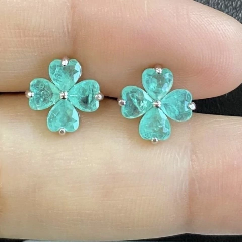 BRINCO PRATA 925 TREVO PEQUENO QUATRO PÉTALAS DE CORAÇÃO/ ESMERALDA COLOMBIANA
