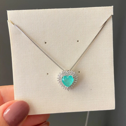 COLAR PRATA 925 PRINCESS CORAÇÃO/ 2 FILEIRAS CRAVEJADAS/ ESMERALDA COLOMBIANA